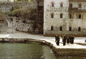 The boats from Ouranoupolis take the visitors to Daphni, the main port in the middle of the peninsula. On the way, they also make intermediate stops on monasteries along the coast. From Daphni one can catch a bus to Karies, the administrative centre of the monastic society and from there other buses to any of the monasteries. Or, from Daphni one can travel even further south up until Karoulia, at the foot of the mountain, by corresponding boats. Alternatively, from the north side the boat stops to all the monasteries on the sea, until the monastery Megistis Lavras, if the weather is kind.