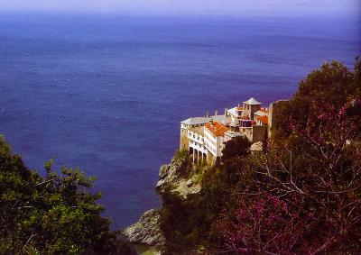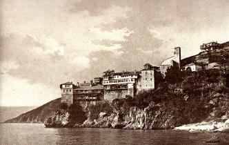 Built on a rocky coast on the southwest side of Mt. Athos between the monasteries of Simonos Petra and Dionysiou, it was founded in the 14th century by the monk Gregorios, from whom it received its name. It was brought back from desolation by the ruler of Moldavia, John Stephen in 1500. It was burned in 1762 to be renovated by Ioakeim thanks to donations from Constantinople. Its Catholicon is of the 18th century, frescoed in 1779 and its feast day is St. Nicholas on December 6. Its library contains just 297 manuscripts and about 4.000 printed works as many books were destroyed by the fires. The monastery is 17th in the hierarchy of Mt. Athos.