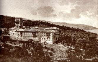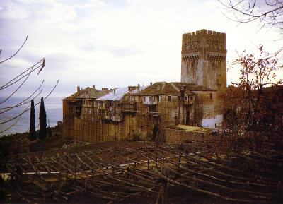 Karakalou is built on a slope on the northeast side of Mt. Athos, half an hour's walk from the sea. Its existence is mentioned as early as the 11th century. The Catholicon is of the 16th century, frescoed in 1716. its feast day is on June 29, honoring the Apostles Peter and Paul. The impressive tower of the monastery as well as the arsenal are also 16th century structures, built with the financial aid of the ruler of Wallachia Peter. Due to lack of space in this monastery there is no Phiale at the courtyard. The arsenal tower is probably older. The library contains 270 manuscripts and approximately 2.500 printed works. The monastery is 11th in the hierarchy of Mt. Athos.
