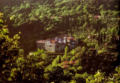 Konstamonitou is built on the southwest side of Mt. Athos approximately 1 hour from the sea. Its existence is mentioned from the 11th century. Its Catholicon is of the period 1860-1871 and its feast day is St. Stephen on December 27. Among its relics is the very old icon of St. Stephen, the icon of Theotokos Odigitria and the icon of Theotokos Antifonitria. Its library contains 110 manuscripts and many printed works. The monastery is 20th in the hierarchy of Mt. Athos.
